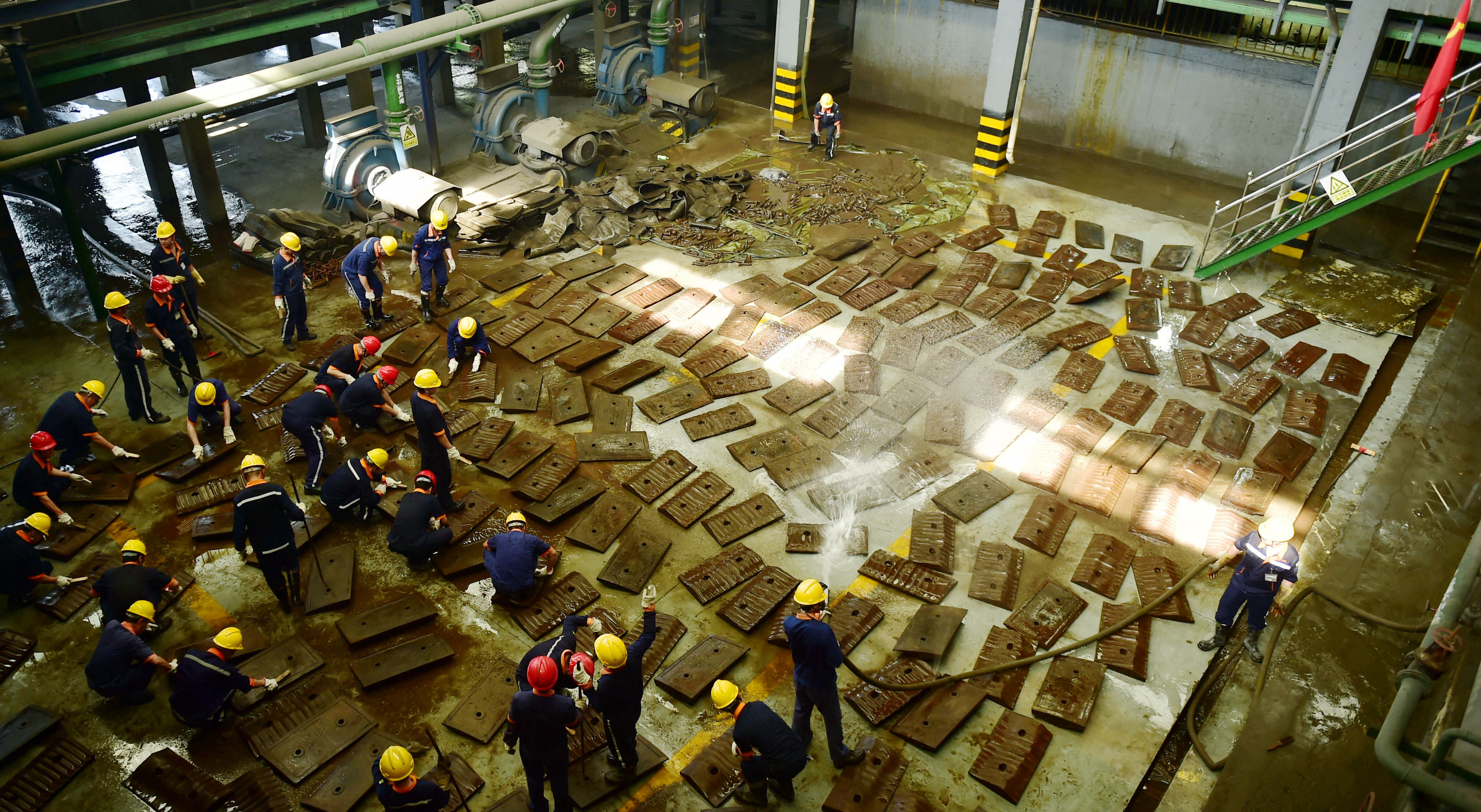 在近1个半小时的紧张突击劳动现场,党员干部齐上阵,有的拿起高压水管冲洗衬板,有的拿着钢丝刷不停地刷衬板,有的插着撬杠翻动衬板,还有的挥着大锤敲打衬板……个个干得汗流浃背,整个磨浮工段作业现场呈现热火朝天的景象。
